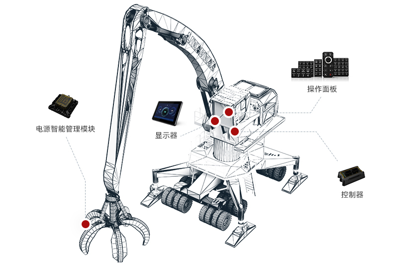 抓料机电控系统可实现抓斗旋转抓放、动臂斗杆控制、抓料机上车回转功能,并对实时车况进行监控,配置视频监控设备实现对抓料机后方及抓斗作业区域进行监控。该系统可运用于砂厂、林场、废铁场等。